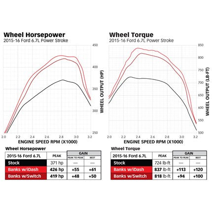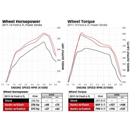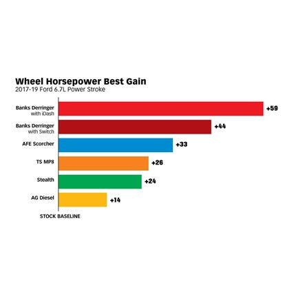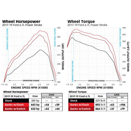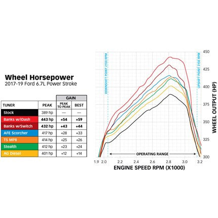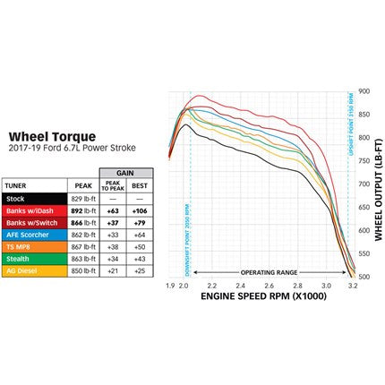 Test Vehicle: 2019 Ford 6.7L Power Stroke F-250. Factory intake and exhaust. All tests run on same truck, same day, same conditions. Tested on Mustang DYNO, 19 second sweep.