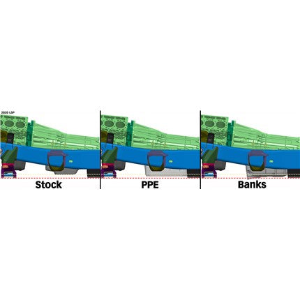 Even with the larger 10 speed Allison transmission tucked between the frame, the Ram-Air Transmission Pan is engineered so that the lowest point is only the sacrificial front scoop while still providing 3 additional quarts of fluid capacity.