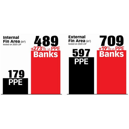 What happens when the Ram-Air goes against the competition? While others claim to have massive cooling ability with their designs featuring fins that cross haphazardly across their surface with no consideration for fluid dynamics, the Banks Ram-Air still comes out on top in total internal and external fin area.
