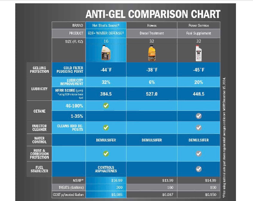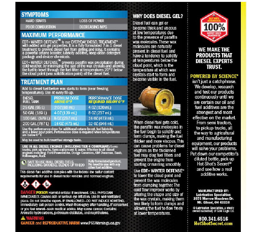 EDT+ WINTER DEFENSE is our EVERYDAY DIESEL TREATMENT with added anti-gel properties. It is a fully formulated 7-in-1 diesel treatment to prevent diesel fuel from gelling and icing. It contains a powerful cetane booster, LX4 lubricity additive, keep-clean detergent package and de-icer chemicals.