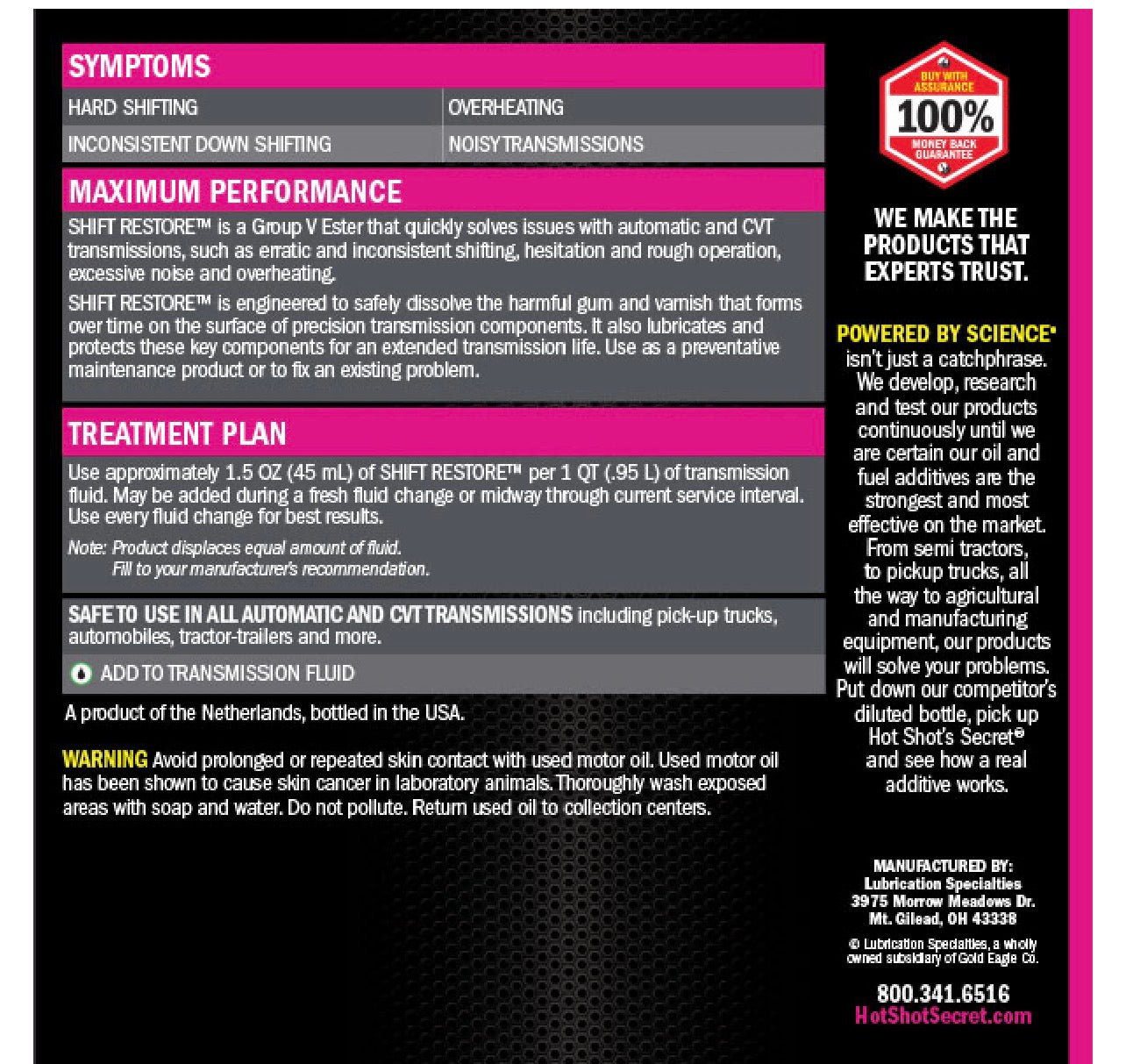 SHIFT RESTORE is a Group V Ester that quickly acts to solve issues with automatic transmissions, such as erratic and inconsistent shifting, hesitation and rough operation, excessive noise and overheating.